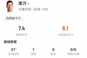 体育资讯1月4日讯 巴萨在本轮西甲对阵西班牙人,莱万本场数据如下:
