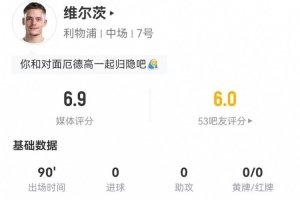 体育资讯1月9日讯 利物浦在本轮英超对阵阿森纳,维尔茨本场数据如下: