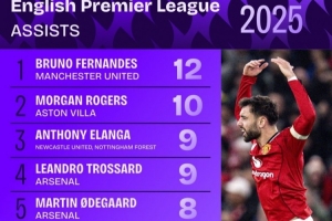 体育资讯1月1日讯 Squawka统计2025年英超球员助攻次数榜,B费12次居首,摩根·罗杰斯10次第二。